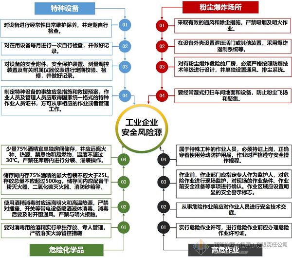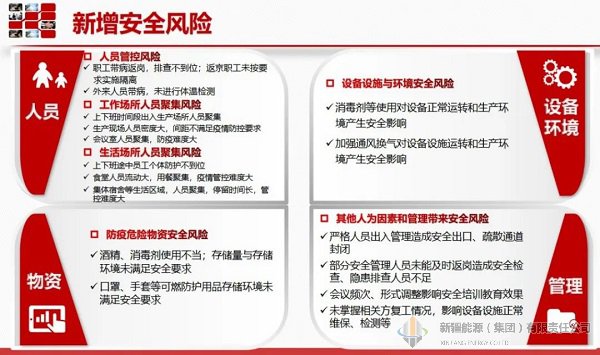 在充分辨识固有安全风险的基础上,重点关注酒精、消毒剂等使用给人员、设备设施、场所环境带来的新增风险,科学核定各类风险的等级。对外地返岗的职工,落实各项登记观察等措施,严防输入性疫情风险;加强环境卫生整治,做好宿舍、食堂、车间等重点场所的通风、消毒工作;为员工提供必要的防护用品,严格执行车间入口体温检测等制度。通过采取各类措施,有效管控固有安全风险和疫情下新增安全风险。