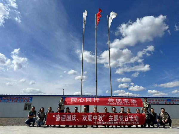 立新能源公司第三党支部与工程管理部共同组织开展“喜迎国庆、欢度中秋”主题党日暨走访慰问活动。全体党员亲切慰问了奋战在奇台30万千瓦(风光同场)一体化项目基建施工现场的干部员工,为他们送去中秋佳节祝福。