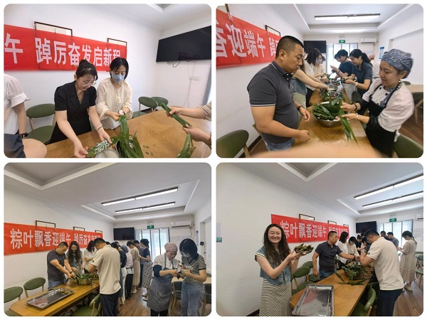 职工们欢聚一堂齐动手包粽子,捋粽叶、做漏斗状、填糯米、压紧实、封口、扎捆…一片片清香的粽叶、一粒粒晶莹的糯米,在大家的精心装扮下变成一个个三角形、牛角形的粽子,现场欢声笑语,其乐融融。大家围坐在一起,品尝着美味的粽子,感受着节日的温馨和幸福。