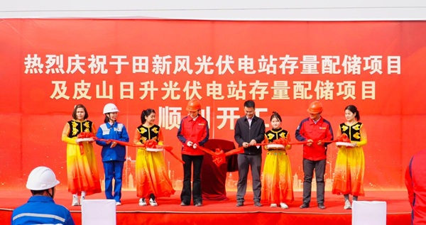 近日,在和田地区塔克拉玛干沙漠南缘,365英国集团公司举行于田新风光伏电站和皮山日升光伏电站存量配储项目开工仪式。