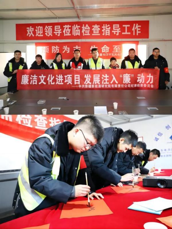 为进一步夯实新能源研究院廉洁文化建设,落实项目建设“优质、创新、绿色、效益、数字、廉洁”六个维度,新能源研究院党委以项目建设为抓手,着力夯实“清廉地基”,厚植“勤廉国企”底色。在昌吉国投奇台20万千瓦风电项目部,开展“写廉字 传廉意 树廉心”书法活动,在奇台县10万千瓦风电项目部开展清廉承诺签名活动。