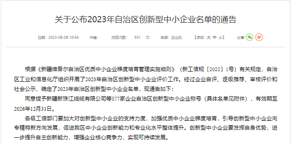 为增强企业核心竞争力,实现可持续发展,准东环境公司组织开展“创新型中小企业”申报工作。完成资料整理准备、自评后进行了申报,经过逐级审核、推荐,最终于2023年8月8日,被自治区工业和信息化厅认定为“创新型中小企业”。