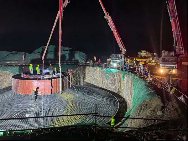 该工程位于昌吉州奇台县境内,风电场场地地貌特征为剥蚀残丘,地形地貌较为复杂,本次浇筑的风机基础为金风6.7MW机型,风机基础直径为22米,基坑深度为4.2米。为确保首台风机基础浇筑顺利完成,立新能源公司多次组织设计单位、监理单位、施工单位和设备厂家召开工程例会及专题协调会议,审核编制大体积混凝土施工专项方案,提前对参建人员进行安全技术交底,对混凝土浇筑、养护等细节进行周密安排,并多次考察商砼站,确保混凝土供应及时可靠,安排专人专责进行逐一核查,严格执行相关技术方案与施工标准,严把施工质量,梳理安全隐患,避免了施工过程中可能出现的隐患或不利影响。在经过12个小时的连续作业后,814方混凝土成功入模,进而转入首台风机基础大体积混凝土浇筑收光作业。